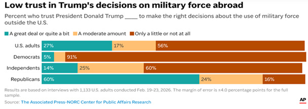 More troubling is that a majority of Americans don’t trust Trump to “make the right decisions about the use of military force, “ according to recent AP-NORC polling. About 6 in 10 Republicans do have a high level of trust in Trump, while roughly 9 in 10 Democrats and 6 in 10 independents have a low level of trust in him.
