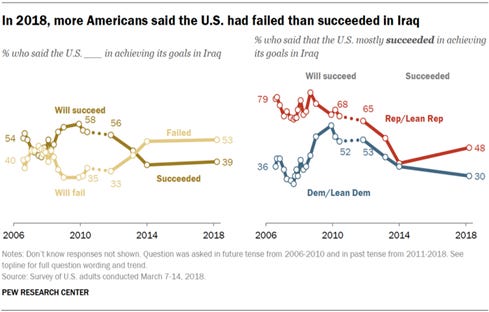 As noted, we witnessed in the Iraq invasion during the Bush administration initial overwhelming support for the Iraq invasion – job approval up about 20 points, at 71%. Even a narrow majority of Democrats (53%) believed Bush made the right decision. But by 2014, as setbacks mounted, public opinion cratered.